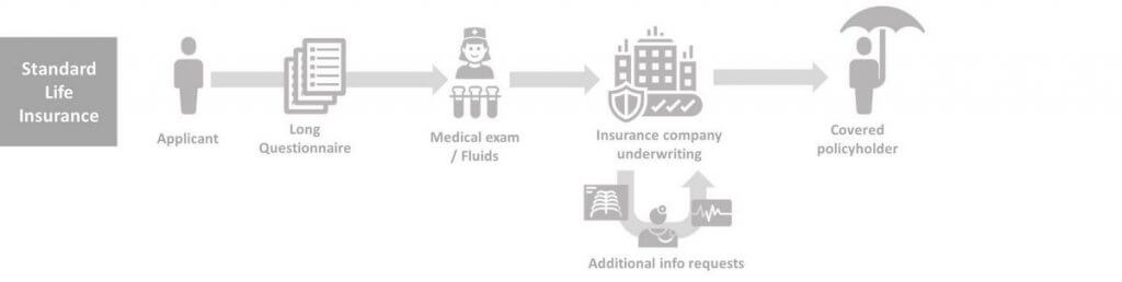 Just for comparison, we show what the same process looks like for a standard life insurance policy (e.g. term life insurance). It is more complex, includes completing a long questionnaire (multiple pages), requires a medical exam and has an extensive underwriting process during which an insurance company can request additional documents from you or your doctor.